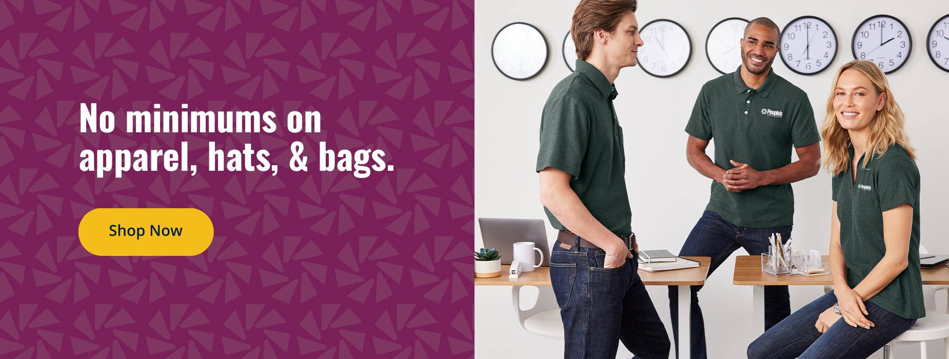 - We have a great selection of apparel, hats, and bags available in single quantities.